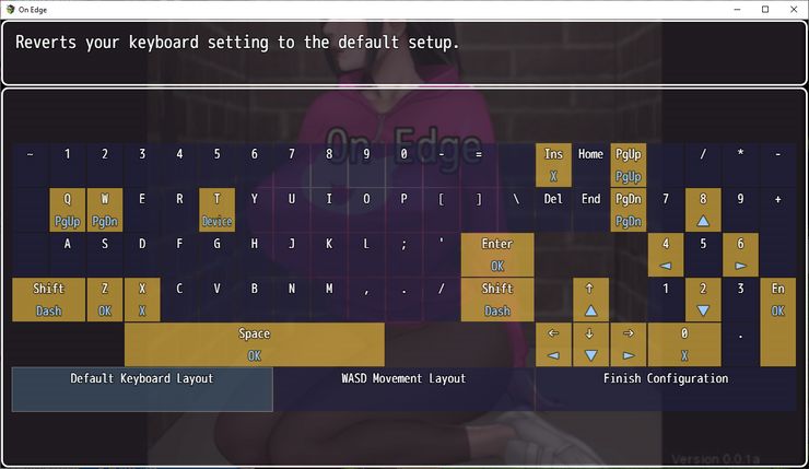 I decided to add this section because I had some messages that people were confused about how to play. The default configuration can be seen in the following image. After v0.1, when you fire up the game, you can go to "options" -> "keyboard config" and change all the keys too.