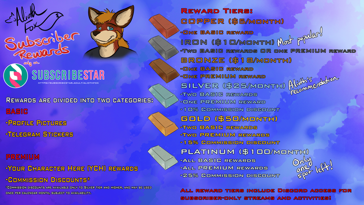 I have two different categories of rewards! There are BASIC rewards, which include profile pictures and Telegram stickers, and there are PREMIUM rewards, which include my YCHs. Some of the higher premium tiers also get access to commission discounts (when I'm open). Returning members may also notice that I have now introduced a BRONZE tier!