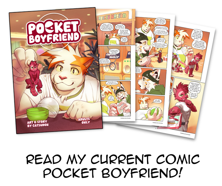 Support me for early access to my web comic, Pocket Boyfriend, right here on SubscribeStar. For additional support, see work-in-progress shots and exclusive sketches on my Catsu Corner posts. For the highest tier, you'll get extra early access to Illustrations and Quickie Comics, which are two-page humorous adult comics! All tiers gain access to exclusive channels on my Discord server.