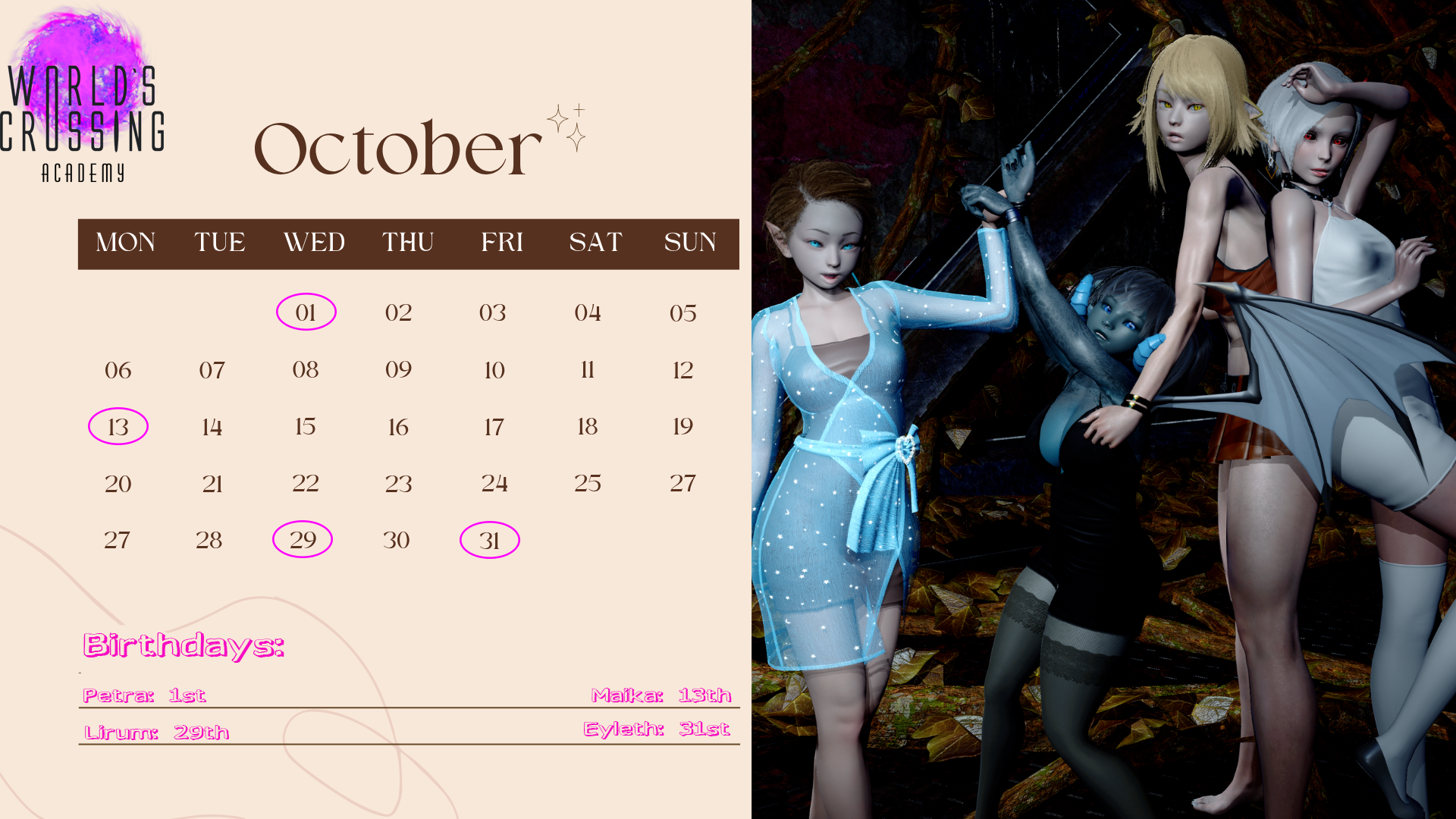 You can get the unwatermarked calendar and the accompanying render in 4K on this Subscribestar post or this Patreon post, at Free Tier or Tier 1, as well as all the rest of the calendar packages, all organized into one folder where you can download them all!
