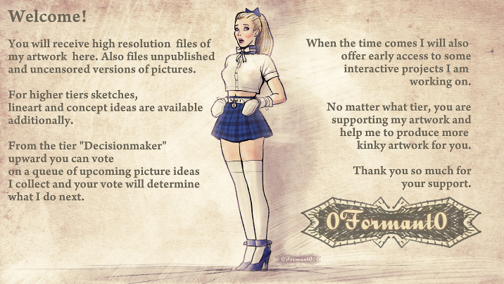 I will ido a sketch or an illustration (depends on how complex the content is) to your personal preferences each month or one more detailed piece every other month. Please no Underage, Snuff or Amputation motifs.