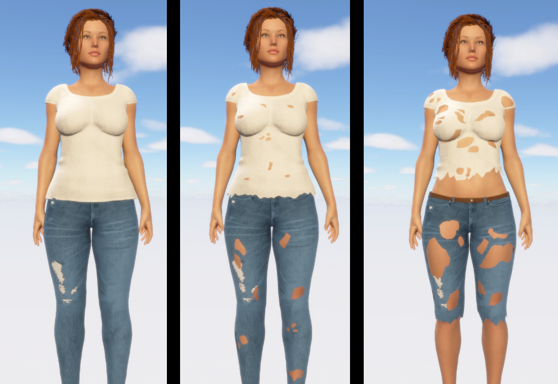 Anyway, on the time I could spend on the game, I've been focusing on the clothing destruction feature. Since we're talking sex battles, it'll mean clothing damage to reduce enemies defenses. I'm aiming at 4 levels : undamaged, little damage, heavy damage, destroyed. The post preview gives you a preview of what you can expect. The result is not the best but its advantage is the easiness to process the damage texture. Here is a sample of how it works :