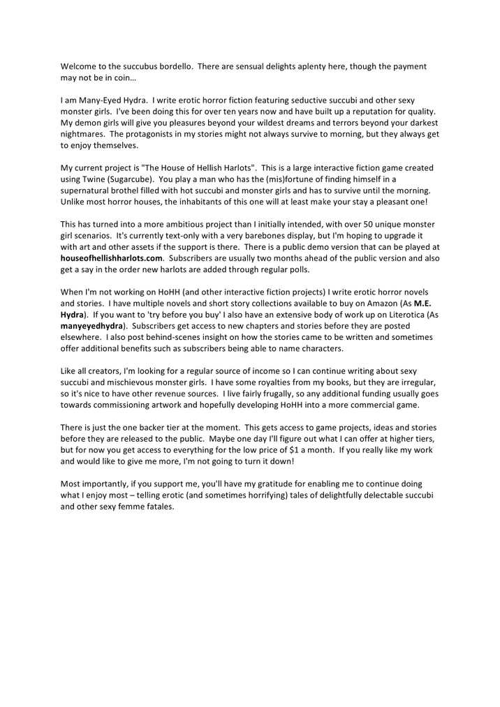 I am Many-Eyed Hydra. I write erotic horror games and tales featuring seductive succubi and other sexy monster girls. These demon girls will give you pleasures beyond your wildest dreams and terrors beyond your darkest nightmares.