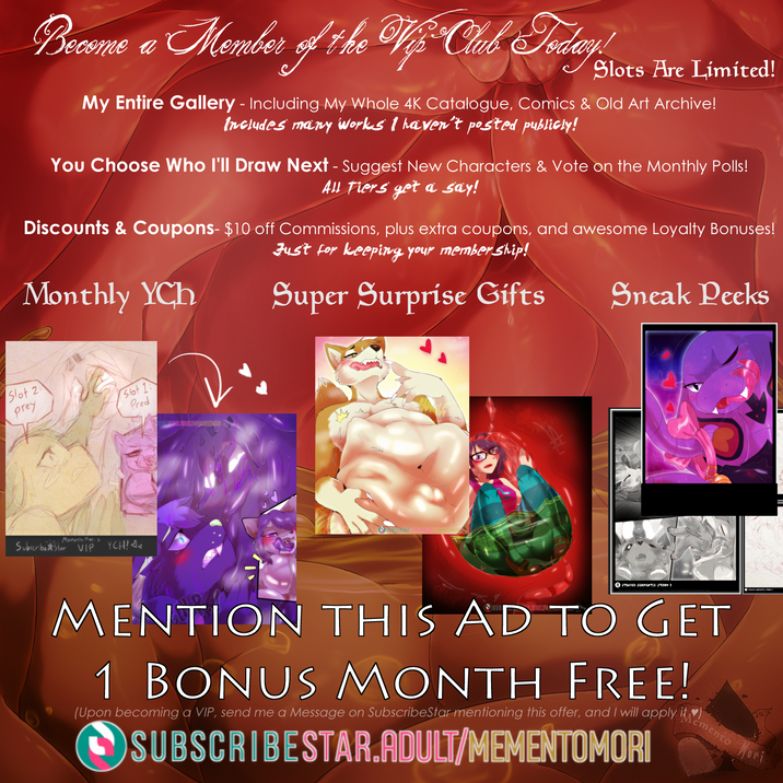 Loyalty Bonuses: Custom Grayscale Comic Page or Full CG Illustration for all your yearly subscription anniversaries! (Plus, your Birthday Gift Freebie Slip renews every year you keep your active membership!)