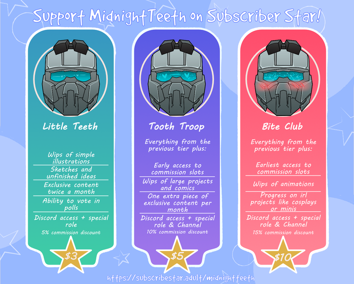 Early access to commission slots Wips of large projects and comics Extra exclusive once a month Discord access