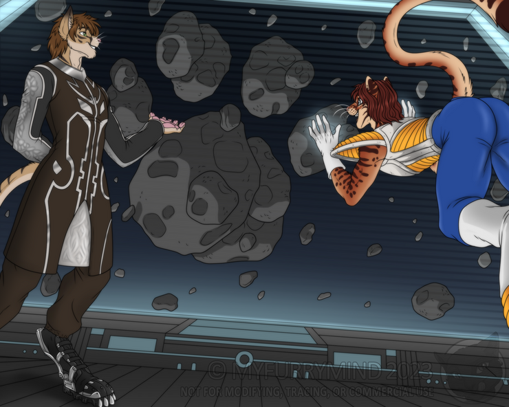 It was pretty fun to create this sci-fi scene, where Wildcat is showing Elijah the wonderments of space and their unpredictable formations. However, while Wildcat recommended some formal attire and gravity boots to Elijah for a better experience aboard his space shuttle, it seems that the ocelot decided the opposite by choosing one of his cosplay outfits that fit well with their scenario (I'm a fan of the series, so I suggested the saiyan suit to parody with, hehe) and skipping on the boots for a full on space experience.
