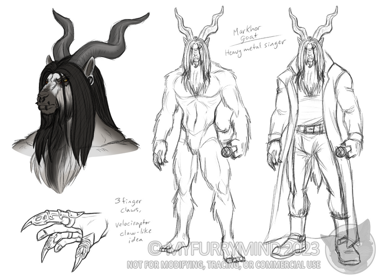 Anyway, these are quick concepts of my markhor character, named Ender, that I've been wanting to do for so long, 'cause I can't get enough of the rocker/metal culture and their dark yet understanding nature. Remember when I was asking for some rocker furs to submit their characters for me to draw? Well, he's gonna be a part of a little tribute that they will also be involved in. Not gonna spoil it out too much, so that's as far as I'll go!