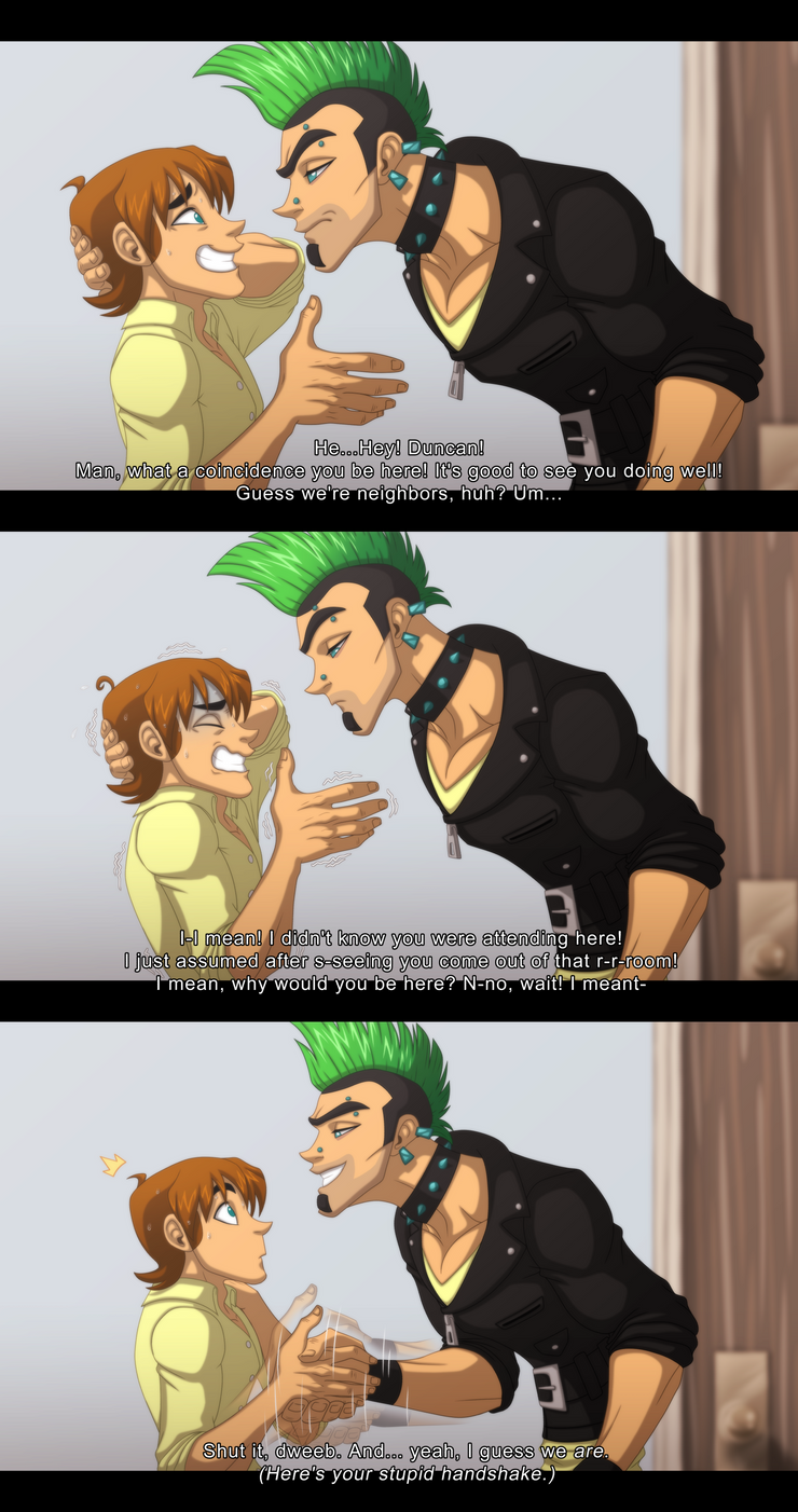 Other than that, the story that I want to incorporate for these two is that Duncan is "forced" by his father to attend a college in order to get him out of his punk-ish behavior. Coincidentally, Cody is studying under the same college and looking to get a degree out of it (yet to be determined what that would be, hehe). In these shots, Cody happens to see him coming out of a dorm and tries to greet him as bravely as he can, hoping that their old history and shenanigans on Total Drama would have been put behind them. Surprisingly, he got a greeting in return from Duncan that didn't involve him getting hurt. However, this new behavior may be too out-of-character for a punk like him, so it just makes Cody questionable about him and still a little afraid of him.