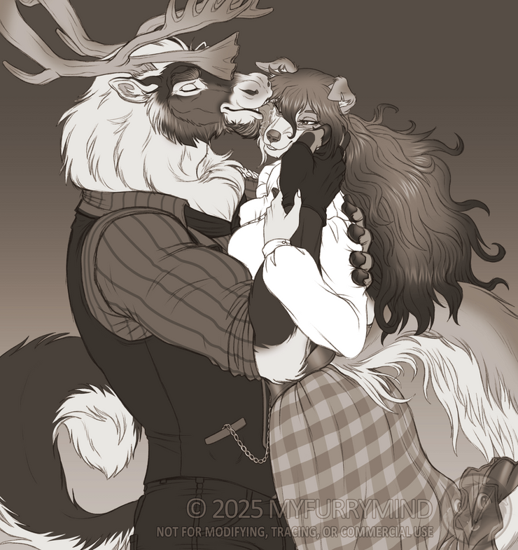 This one is a Flat-Monochrome Sketch of her OCs, Flint & Isabelle, with Flint lifting up and giving a big wet lick to his special little companion. I decided to use Flint's defaulted attire to compliment Isabelle's formal wear, then splashed over a dull-sepia like tone to give it that classic western feel.