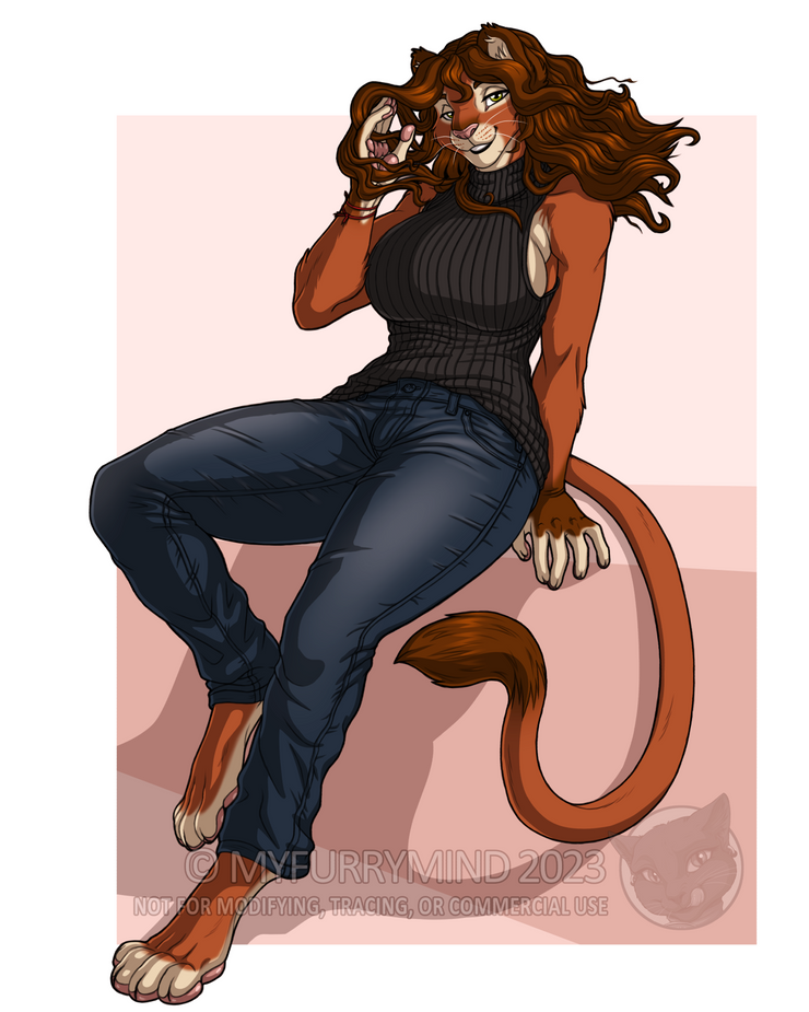 Worked on a Color Commission for TigrisAstartes (from Twitter) who gifted this to SudanRed (from Twitter), who is the beautiful lioness character here! Really had fun being able to work in this style and also explore some new things when drawing up each cloth, hair, feline feature, and etc. on this gal. They loved how it came out, so hope you guys do too!