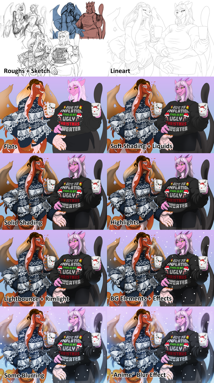 This one features her dragon/orca/goo hybrid OC (left), Vivian, and her friend's Mew/dragon OC, Alterationartist, having a good chat over some hot chocolate out in the winter snow. The mugs were looked up on google and altered a bit to make it matching to each other, sort of canon to Vivian's interest in collecting such things. Also, the sweaters were chosen specifically for each of them, so I made sure to detail them out the best I can to make up for their simple design. Overall, I made sure to get it done early to match the current season we're in, despite it being late hehe, so I'd like to treat is as a tribute to the Christmas/New Years Day holidays.