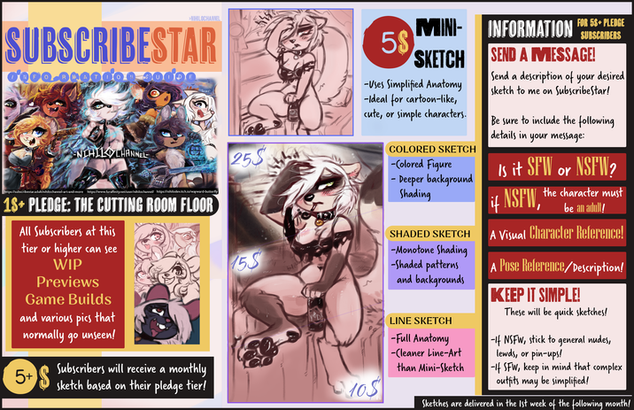 All Subscribers at this tier and above will have access to exclusive posts here on SubscribeStar, including WIP pics, Process Sheets, Previews, and more!