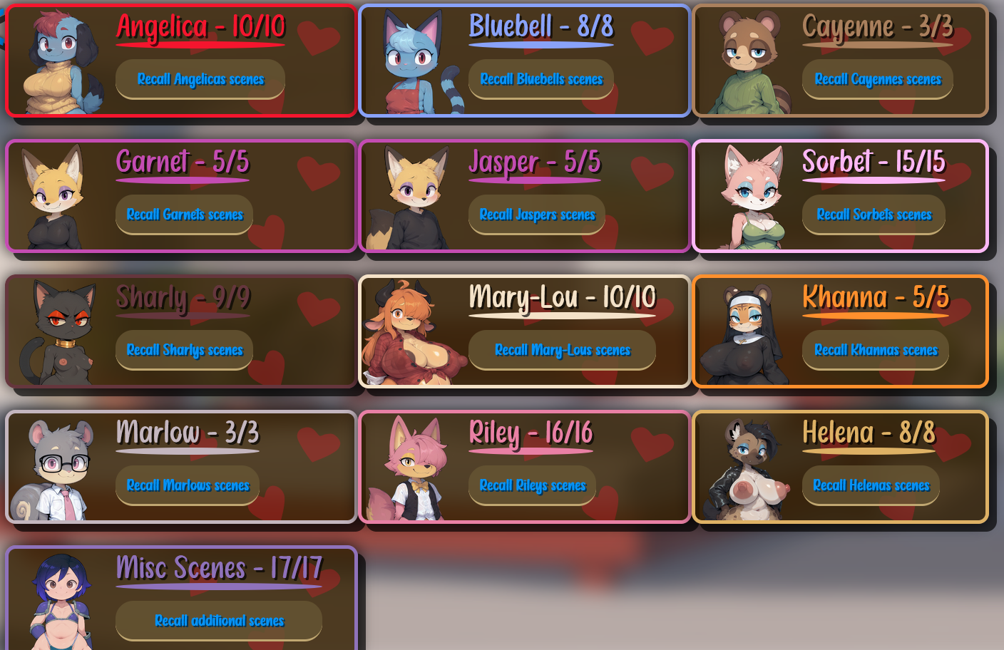 Riley's new content is a pretty good example of how characters will get new content, a short sidequest full of nonlinear scenes. And finally, I wanted to put the new morning scenes into the gallery but given they're very short, only appear randomly, and I may make the hot morning ones only appear in the summer and do seasonal stuff, I kept them out of it. If you'd prefer I do something different with them, lemme know!