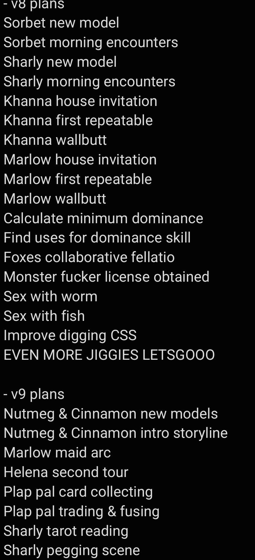 This update ended up being way more veggie-heavy than expected due to Mary-Lou. Because adding the pregnancy-focused character without any pregnancy content would have been very silly, I completed not only her intro but all the way to being invited to her house.