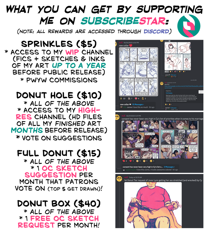 You get access to my private discord server channels where I post WIPs of my comics + high-res downloads of the finished artwork and make suggestions!