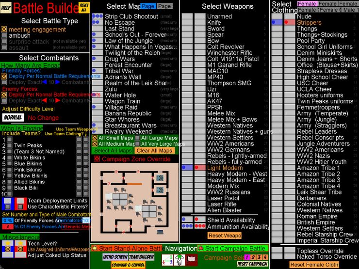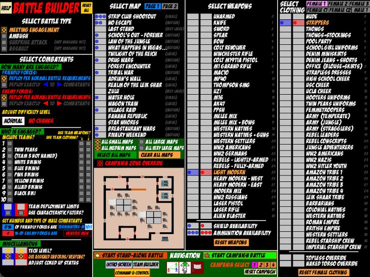 Full enjoyment of Bizarre Battles also requires installation of the BadaBoom font. This font is not a Windows default font, so it has to be installed to your Windows folder to be usable by the game. Compare Screen 1 (BadaBoom font installed) with Screen 2 (not installed):
