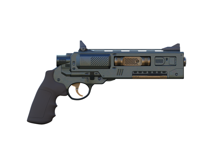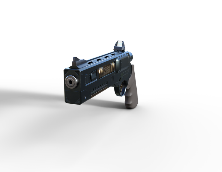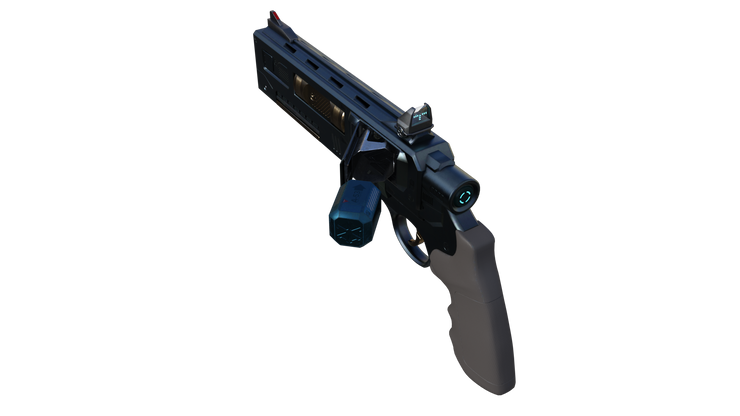 The revolver uses a high-energy battery cell that creates a contained plasma detonation with a variable power output. In previous, larger models, this would launch a jet of hot plasma towards the target. Instead, they are used to activate and propel the solid slug rounds at velocities as slow as 100 meters per second, up to a muzzle speed approaching 5,000 meters per second. The sturdy carbon-fiber lattice maintains the gun’s integrity for these high powered shots and a small circuit board allows for it to automatically gauge the density and weight of the active round and adjust energy requirements accordingly.