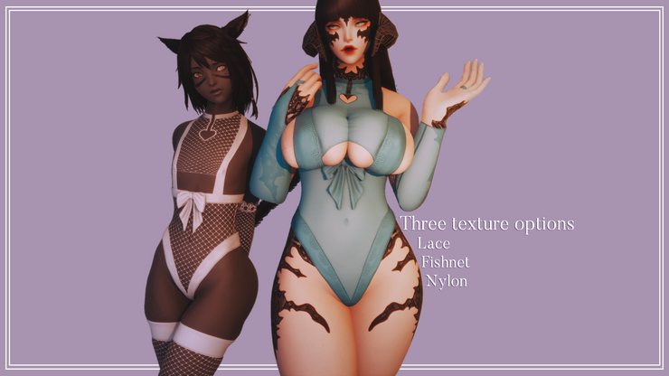 A teddy lingerie set with boob and thigh squish, stockings and long finger loop gloves.