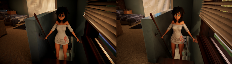 If I didn't explain it before Naomi's shading is now based per pixel instead of based on a single point. So while her lighting is flat on the left it is more gradual on the right getting some light from the window and shadow on the stairs there even though it's not a real light source.