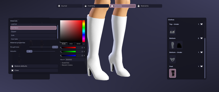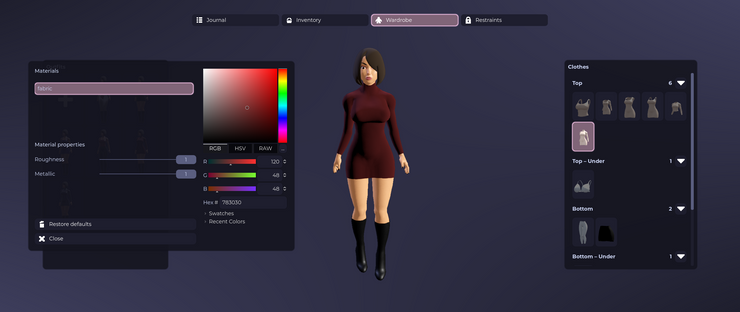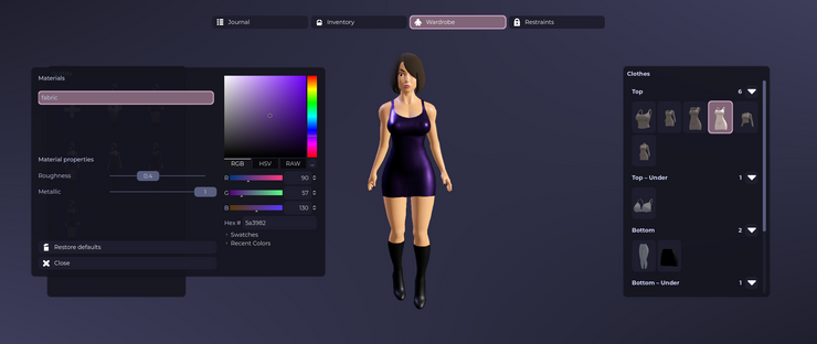 To customize your clothes, go to the Wardrobe tab and right click any clothing you would like to customize and select the customize option. It will open the customization menu where you can see every material of the clothing, each material has a color, a roughness and a metallic parameter.
