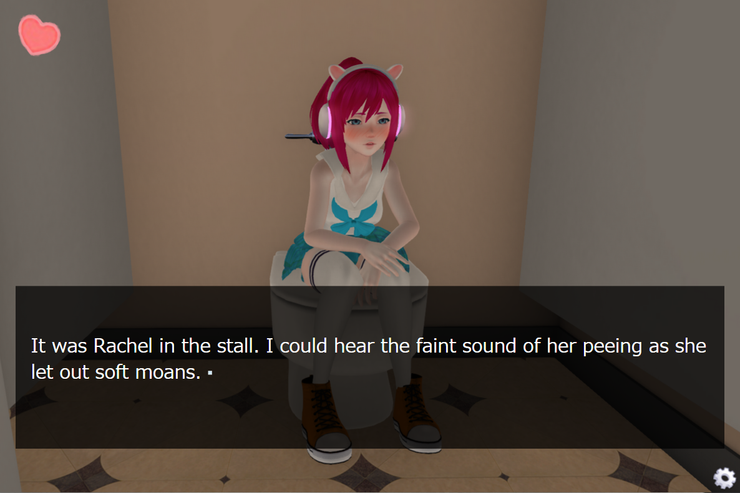 For Rachel, in the morning you peek into the restroom and find her peeing, along with pleasuring herself. By noon, you come across her in the classroom reading about pandas and hanging out together. Then by afternoon, you find her swimming by herself and join her.