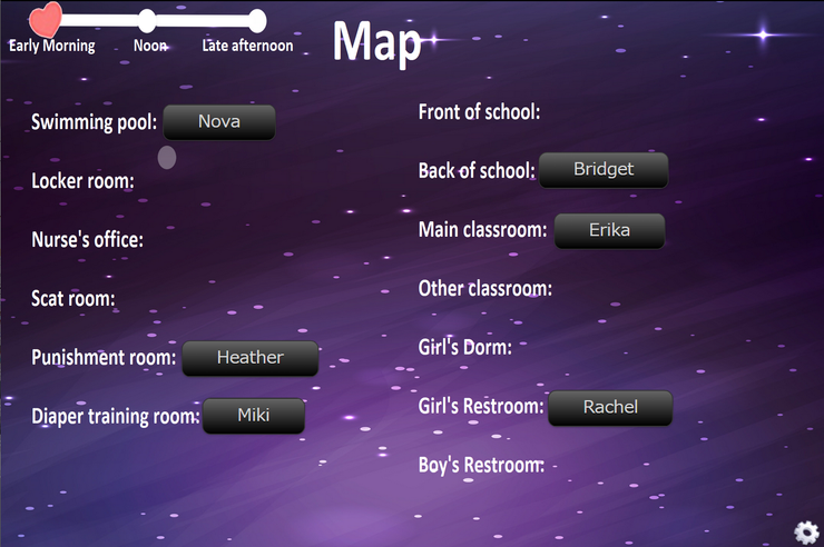 Which brings us to the update itself, since the first update was Chapter 1. We were now working on the “Free Day System” as a base for future content between the main chapters of the game. The main idea with this was having a map interface that was bare-bones, but you’d select a girl to hang out with during the morning, noon and afternoon. In total, you could hang out with a number of girls three times during each free day section of the game.