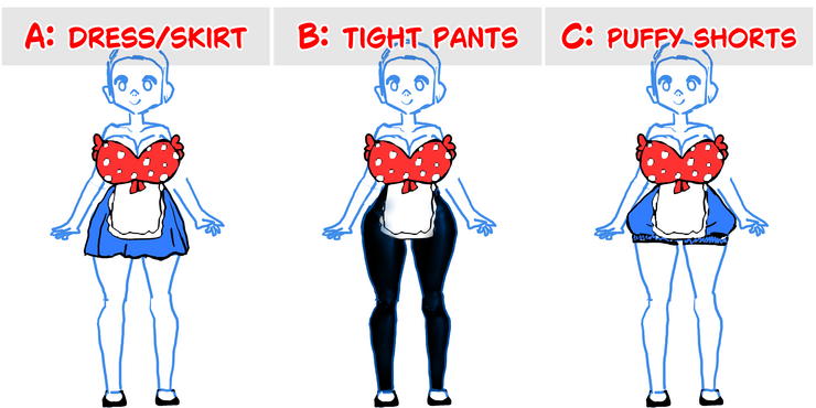 - B: Tight Pants may be good for better view of character shape.