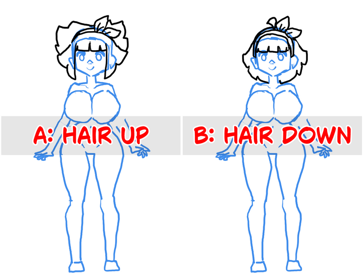 - B: Hair down like her daughter, without side hair. If this hair is used, she would have the ahoge.