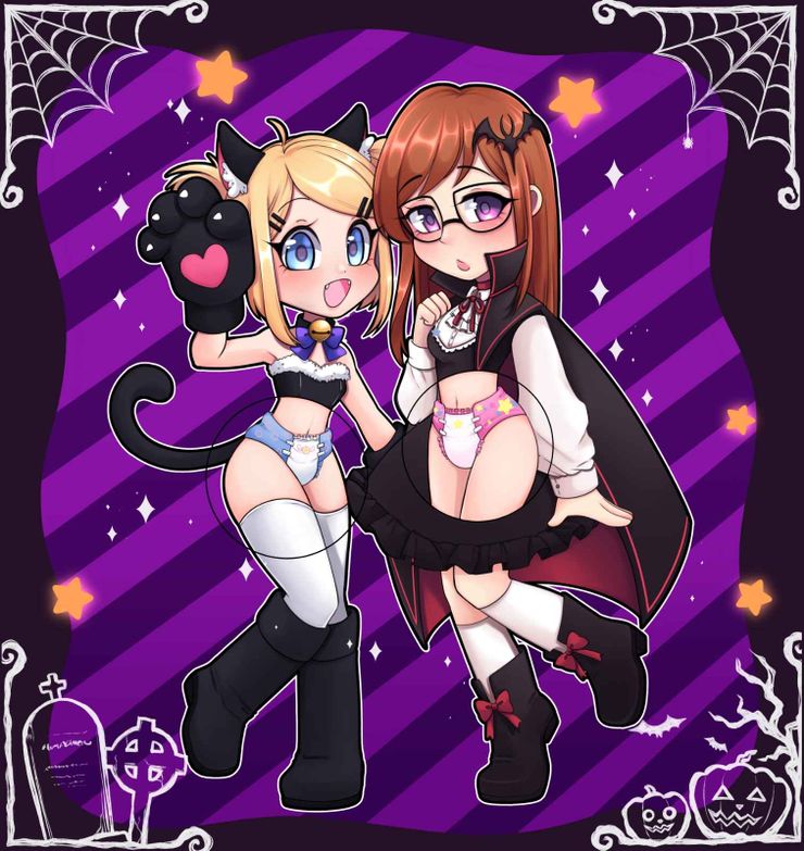 With a few simple words, Miki's body tingled from pure happiness upon realizing the two friends would get dressed up and have a fun time together at the Halloween party! Although, it'd seem Miki's tingling sensation was more than just "pure happiness" as she unexpectedly wet her diaper, which made Erika sigh again, but she soon giggled, and the two girls prepared for the upcoming Halloween party.