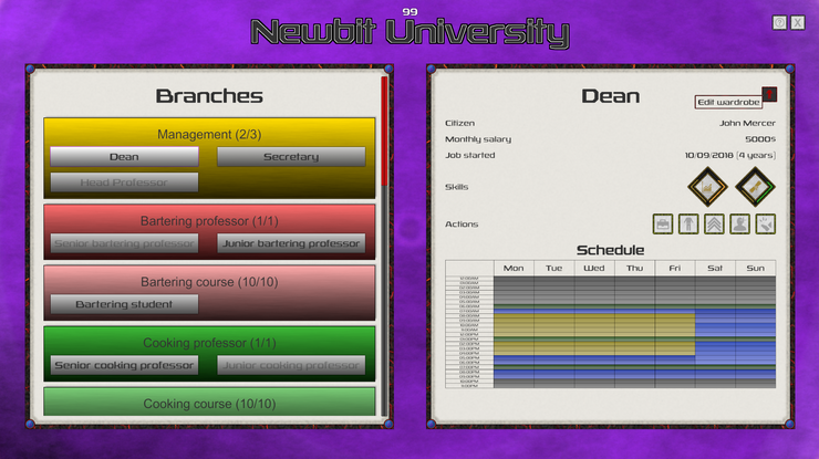 The button to access the job wardrobe is accessible directly from the business panel after selecting a job, in the right panel. This button is only visible if your current job gives you access to wardrobe management which is a new action visible in the list of actions of each job. Currently, only the Dean and the Head professor have access to this button so you won't have access to it in Scenario mode. Moreover, each job has different wardrobe permission. The dean can set any outfit in the business while the head professor can only change the outfits of professors and students.