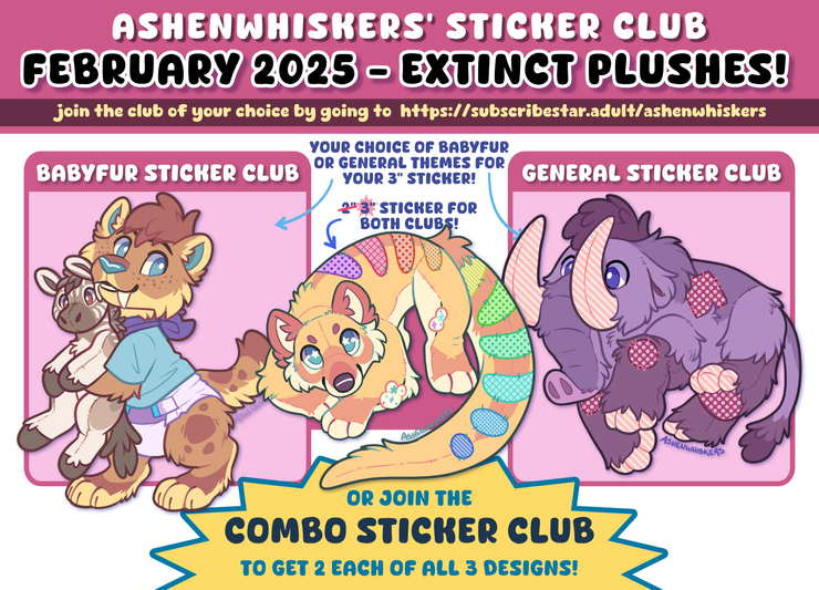 The general sticker is woolly mammoth plush, the babyfur sticker is a saber-tooth tigers clutching a quagga plush to their chest, and the bonus sticker is a plush thylacine! The bonus sticker is usually 2" but thanks to Clover, who offered to sponsor it, the bonus sticker will be a 3" sticker this month!