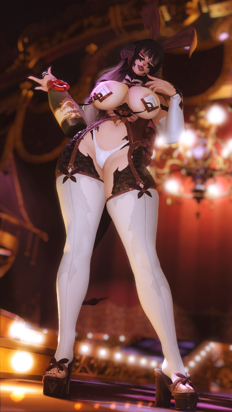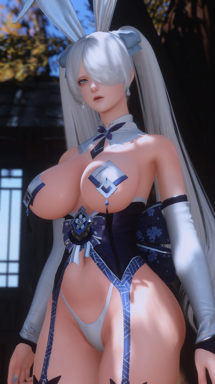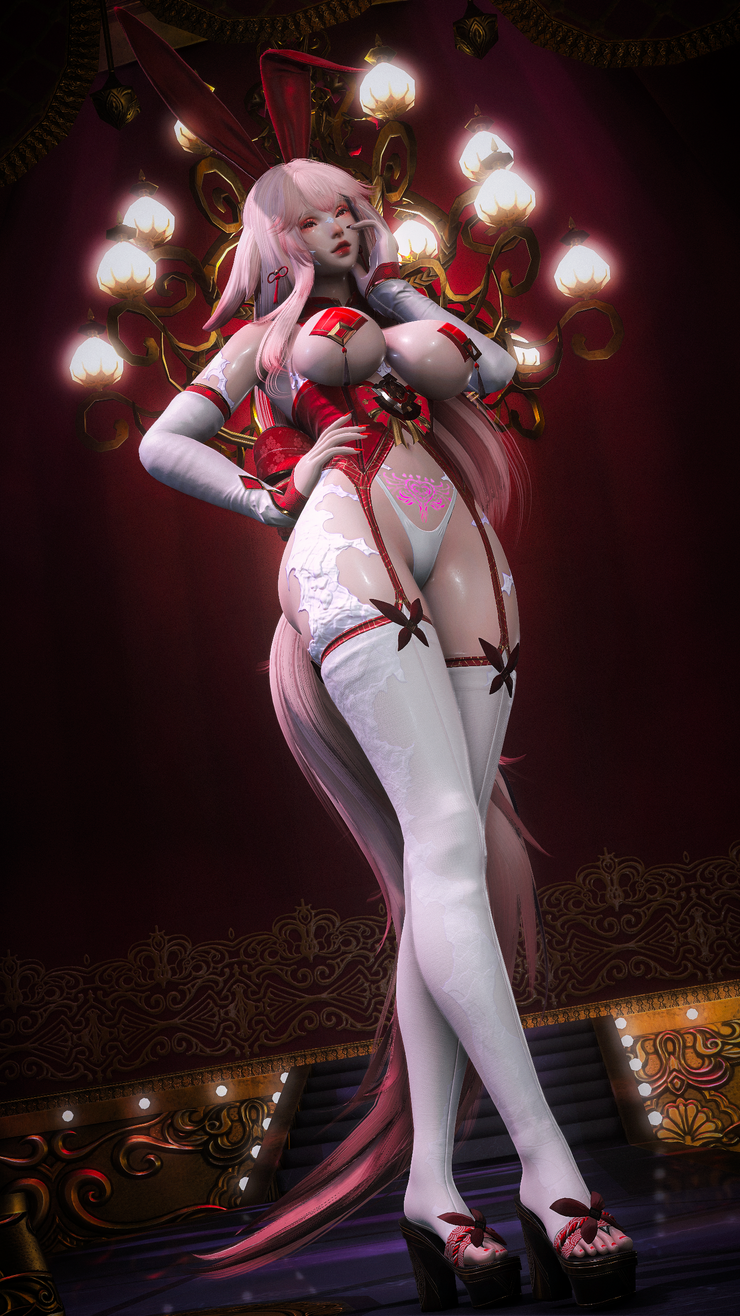A sexy bunny girl lingerie outfit, including ears, a collar, a corset, garters and stockings, a thong, a fluffy tail, pasties with physics enabled tassels, and platform sandals.