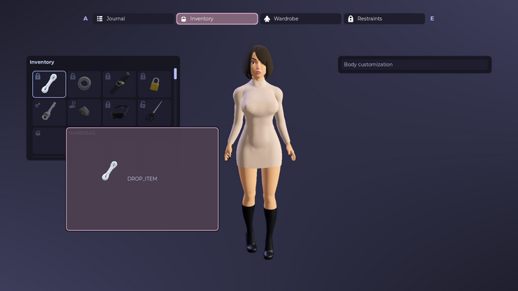 This is going to be an interaction that will open a menu which is going to be like the inventory and wardrobe combined into one, allowing you to take or put items into the inventory of the object and change the clothes of your captive. ;)