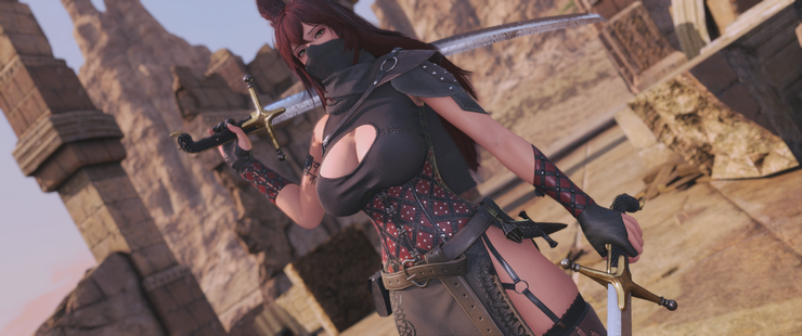 A not very practical set of leather armor. Includes a dress with a corset and pauldrons, a mask and scarf, a belt with squishy stockings, garters and a thong, and high heel boots.