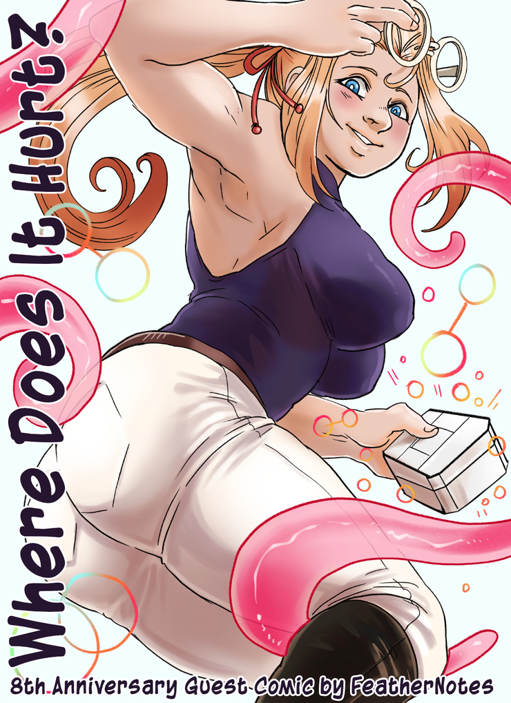 Happy birthday 'Where Does It Hurt!' 8 years making this webcomic and this is our first guest comic. It's been a long time coming but the lovely Krispy (FeatherNotes), co-creator of Ghost Junk Sickness and part of studioCARTRIDGE, made an 8 page short comic featuring Soullon at work in the shop. If you want to see the rest of the comic as it's released through out July all that and more you can join any tier $5 and up here on my SubStar.