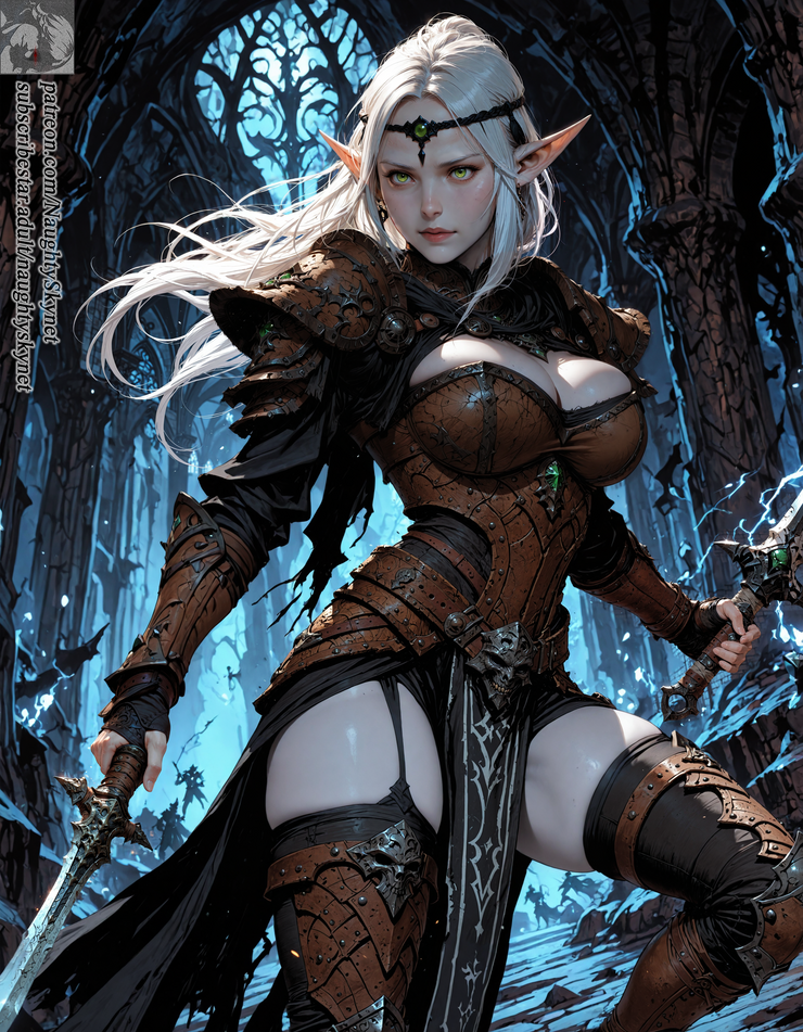 The pale elf moved like a shadow through the ruinous dungeon halls, her emerald eyes cutting through the gloom. Lightning crackled beyond the shattered stained glass, illuminating her weathered armor and the twin blades clutched in her hands—relics of a bygone age, humming faintly with ancient power.