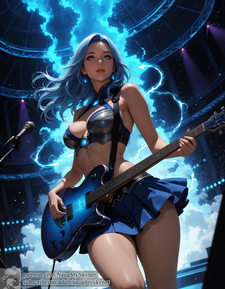 When she plays, thunder answers. Her blue aura surges with raw energy, each note resonating with the pulse of lightning that dances above the grand Sky Coliseum. Tonight, the world listens not to a concert but to a battle hymn — a requiem for the encroaching silence that seeks to swallow sound and sky alike.