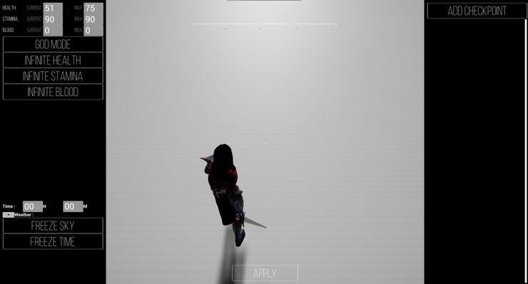 We're making some progress on the cheat system. You'll be able to change things related to Kalyskah's health, stamina and blood. Edit the weather, add checkpoints and also give her new items and spells.