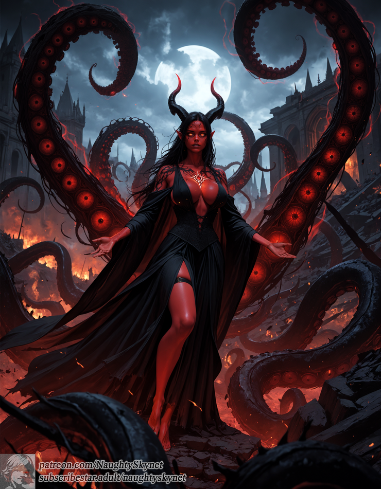 Born of infernal blood and sworn to a nameless deep, the Tiefling warlock sealed an ancient accord, command in exchange for eternity. From shattered stone and burning cathedrals, the abyss rose to obey her will, its tentacled legions coiling like a living crown. As cities fell silent beneath their grasp, she did not smile. This was not conquest. It was reclamation, and the abyss had finally come home.