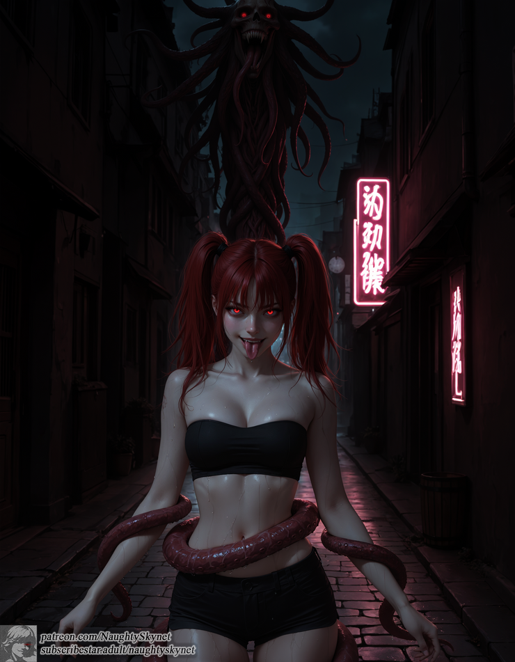 She waits beneath the flickering neon, rain sliding down pale skin, red eyes locked on you the moment you step too far in. The smirk comes first. The tongue follows, playful, mocking, an invitation you should refuse.
