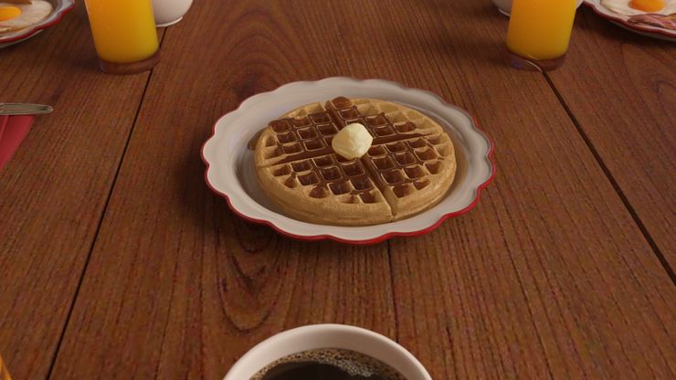 Scene 4 is posed and rendering should finish tonight. It should already be finished but daz decided to spend 8 hours rendering a plate of waffles instead of processing the other files queued. That plate of waffles doesn't look bad, though. It's probably the reflection of the maple syrup that ended taking so much time to render and I hadn't anticipated that.