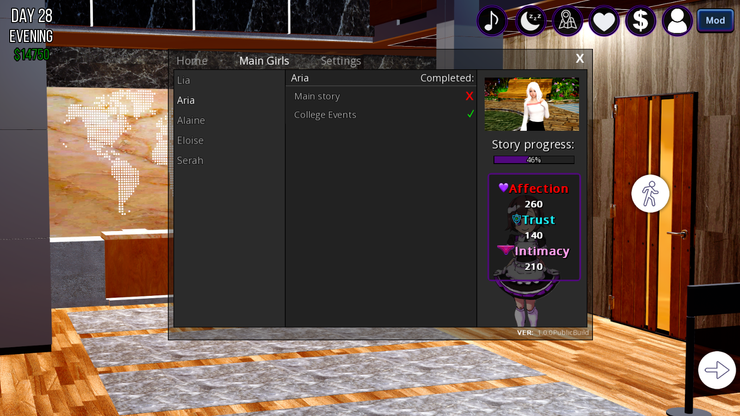 Stats screen: in Main girls new feature, showing stats of the girls and Story completion bar (for their main guide) and a green check to show when there guide is completed