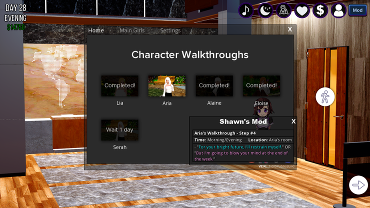 This mod adds an in-game walkthrough for every character and story event in the game The walkthrough menu contains dynamic guides that let you track your progress for each character and see the requirements needed to trigger their scenes and advance their story. The mod guides also show all requirements for getting all possible extra dialogue options and seeing all possible extra content during events and scenes.