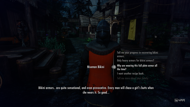 전체적으로 성인용 퀘스트는 아니며 스토리 자체는 유머에 초점을 두었습니다. 그러나 아머 브레이크의 효과로 인해 전투 중 방어구가 벗겨진다거나 사람들이 벗긴다든가 하는 상황이 연출될 수 있습니다. 그 부분은 모드설정에서 조정해주세요. 퀘스트 스토리 자체는 그렇게 방대하지 않으나 모든 방어구를 모으기에는 조금 시간이 걸릴 수 있습니다.