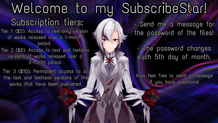 What will you get by subscribing to this Tier? - Sneak peeks and teasers of upcoming works - Download content in the best possible quality (You will have access to the hypno/somno works (Text Only if the story/work has text) released over a 1-month period, which will later be moved to the "Enthusiast " Tier.) - Directly provide me with feedback