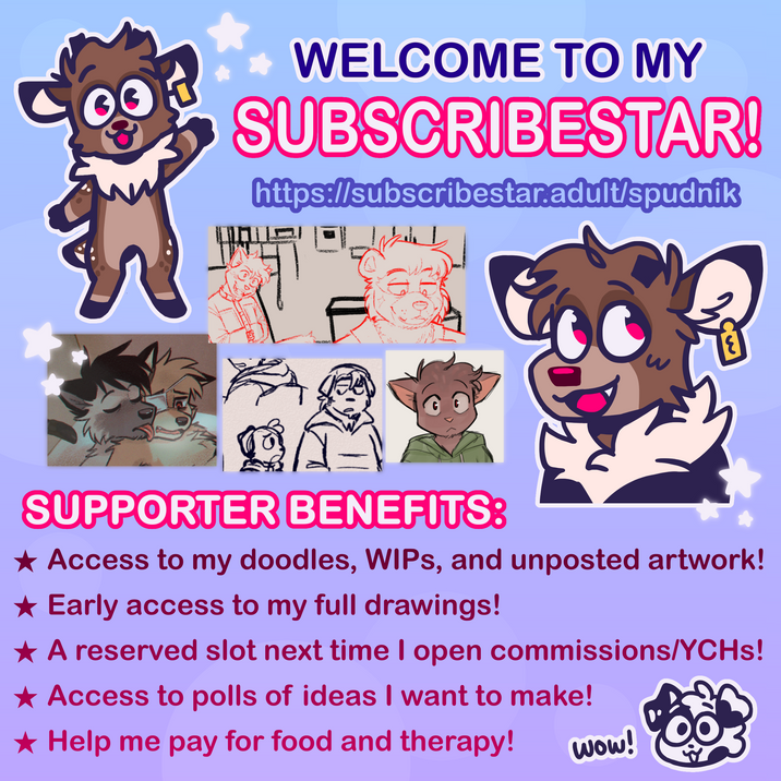 ★ Access to my doodles, WIPs, and unposted artwork! ★ Early access to my full drawings! ★ You get a reserved slot next time I open commissions/YCHs! ★ You get to contribute to polls of ideas I want to make!