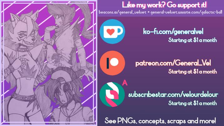I'm General Velvet, or General Vel for short, I'm an African American traditional artist. My work majority of the time revolves around fandoms, with the usual break of sona(s) or requests. However (with the time needed ofc), I might post more art which focuses more on original characters along with other projects to further development into my own stories in the future.